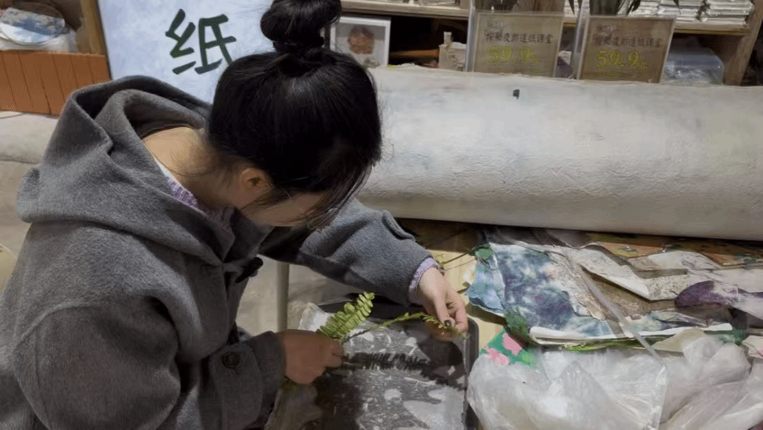 实践体验环节,队员们在戴老师指导下亲身参与古法造纸核心工序。手持竹帘在纸浆池中舀起、摆动,看似简单的动作,却需反复练习才能避免纸页厚薄不均或出现漏孔。初次尝试失败的王同学感慨:“这让我真切体会到‘慢工出细活’的匠心,也明白了非遗传承的不易。”经过多次练习,一张张附着天然树叶印记的手工纸逐渐成形,晾晒在墙面时,在阳光照射下泛出自然光泽,队员们脸上满是收获的喜悦。