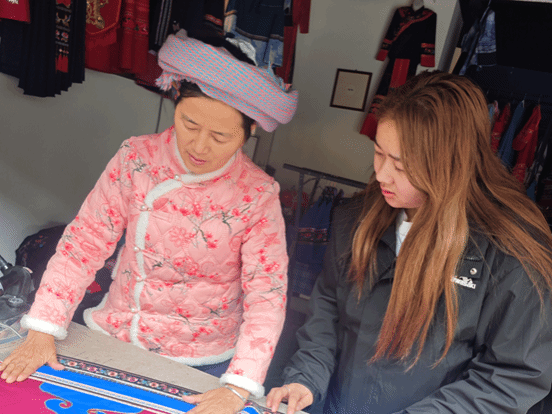 为了更深入地了解蜡染文化,团队走访了当地多家民族服饰店,认真聆听手艺人们讲述关于蝴蝶纹、鱼鳞纹、铜鼓纹等经典蜡染纹样背后的故事。这些融合了自然元素与民族信仰的图案,让队员深刻感受到布依族蜡染技艺文化的精神内涵与生命厚度。