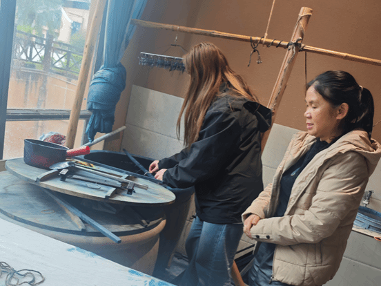 在与韦老师的交流中了解到,当前蜡染技艺的传承面临着技艺周期较长、市场需求波动较大、年轻群体关注度不高等问题。同时,她还表示,随着非遗保护与传承工作日益受到重视,蜡染技艺的发展已迎来新的转机。目前,不少手艺人正尝试将现代设计与文创开发融入其中,为这些手工绘制的“蓝白条纹”注入新的活力。