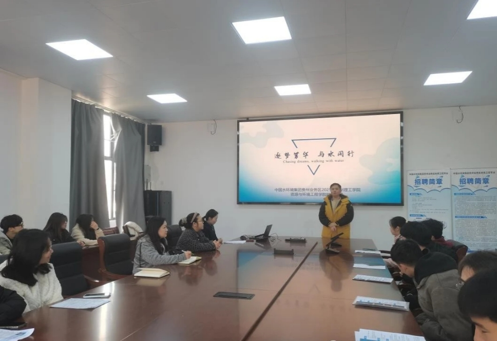 资源与环境工程学院特邀中国水环境集团贵州业务区于3月12日在酝知楼522举办专场招聘宣讲会。学院党总支副书记梁珍、就业工作人员张立微、企业代表及2025届环境工程专业毕业生参会。
