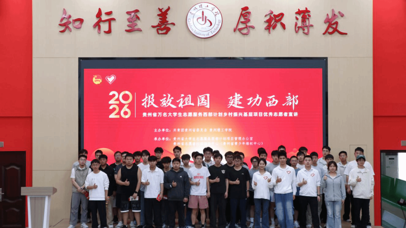 为深入学习贯彻习近平总书记关于志愿服务和青年工作的重要指示精神,进一步扩大大学生志愿服务西部计划乡村振兴基层项目的影响力与号召力,引导广大青年学子扎根基层、奉献青春,2026年4月9日,校团委在科技孵化园路演大厅成功举办2026年贵州省大学生志愿服务西部计划优秀志愿者事迹宣讲会。西部计划优秀志愿者代表杨秋月、陈宇、刘立威应邀宣讲,与在场同学分享基层服务经历,传递青年志愿担当精神。
