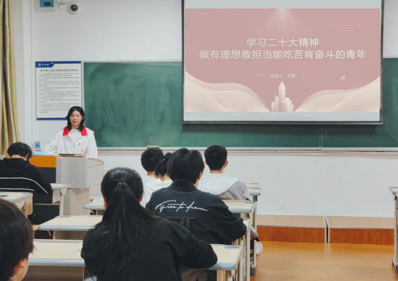 为深入学习宣传贯彻党的二十大精神,引导广大青年牢记习近平总书记的殷切嘱托,争做有理想、敢担当、能吃苦、肯奋斗的新时代好青年。2023年4月11日晚19:30,青年宣讲团成员王微于蔡家关校区2-202教室开展以“学习党的二十大精神,争做有理想、敢担当、能吃苦、肯奋斗的新时代好青年”为主题的宣讲,环境221班同学参加本次宣讲。