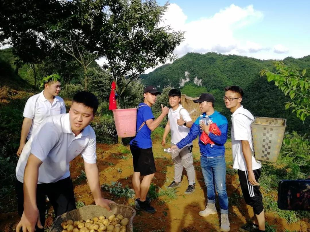 烈日当空,地里热气腾腾。虽然志愿者中有的同学从未下过田地,更没有干过农活,但在当地农民的指导下,志愿者们仍然在刘芳诚老师带领下走进地里,挥着锄头开始挖土豆。很快,大家掌握了劳动方法,背篓里慢慢盛满了土豆。烈日下,志愿者汗流浃背,衣服上也沾满了泥土,但大家在劳动中找到了乐趣,每个人脸上都洋溢着笑容。