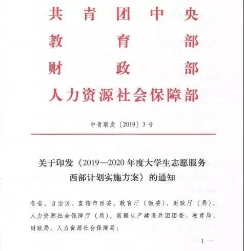 大学生志愿服务西部计划,是团中央、教育部根据国务院常务会议、《国务院办公厅关于做好2003年普通高等学校毕业生就业工作通知》和2003年全国高校毕业生就业工作电视电话会议精神的要求而实施的,财政部、人社部给予相关政策、资金支持。