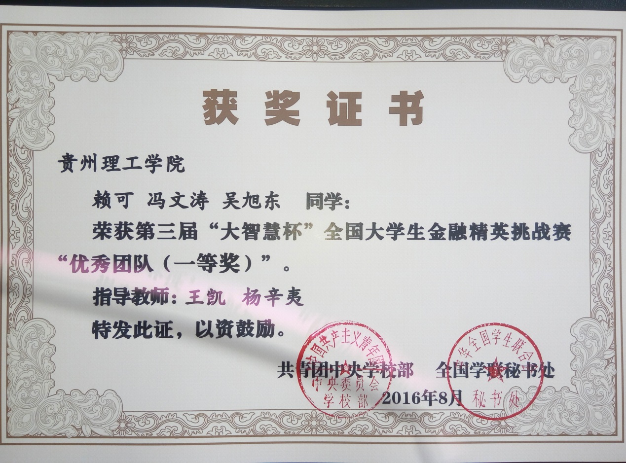 近日,由共青团中央学校部、全国学联秘书处主办,全国学校共青团研究中心协办,上海大智慧股份有限公司承办的2016年第三届“大智慧杯”全国大学生金融精英挑战赛落下帷幕,其中校赛由经济管理学院承办。我校学生第一次参加该项比赛,经过激烈角逐,获一等奖一项,三等奖三项。