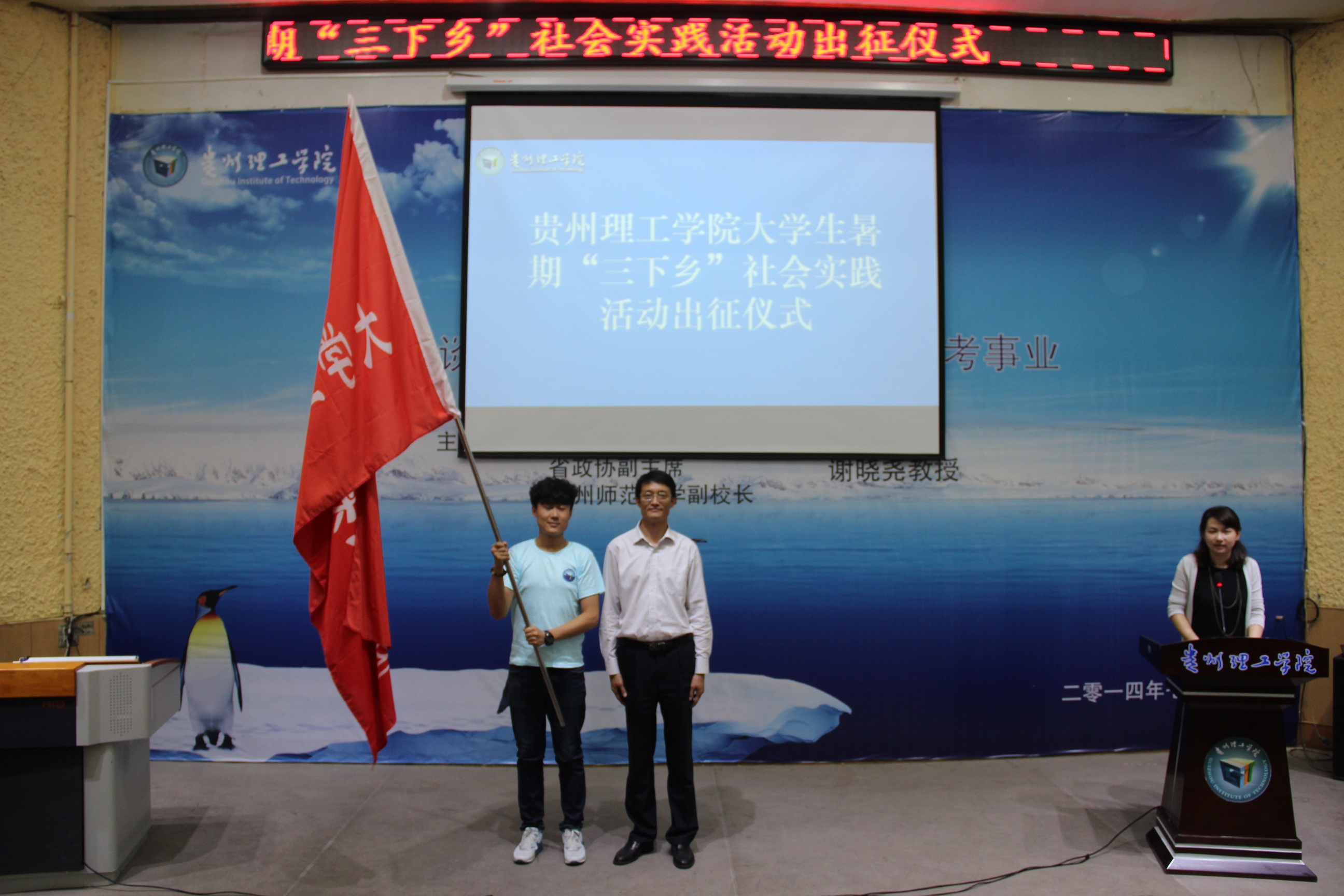 7月17日下午,贵州理工学院2014年大学生暑期“三下乡”社会实践出征仪式暨安全培训大会在逸夫学术交流中心小报告厅举行。校党委副书记宋广强、学生工作部部长徐元敏、副部长孙凯、党委宣传部副部长詹凤合、各学院团总支负责人、实践团队带队教师、实践团队成员150余人参加了出征仪式。
