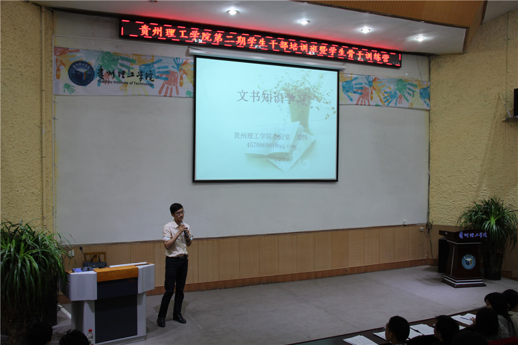 贵州理工学院办公室副主任郑伟为学生干部做“公文知识学习”的培训,他主要讲解了法定公文、法规文书、事务文书这三方面的相关内容,主要介绍了党政机关公文格式、适用单位或机关、工作事项范围及行文的方向,以及法律、法令、条例、规定等法规文书,除此,几种常用文体(通知、总结、调查报告、策划书、社会实践报告、条据)等的格式、写作过程及写作要求。