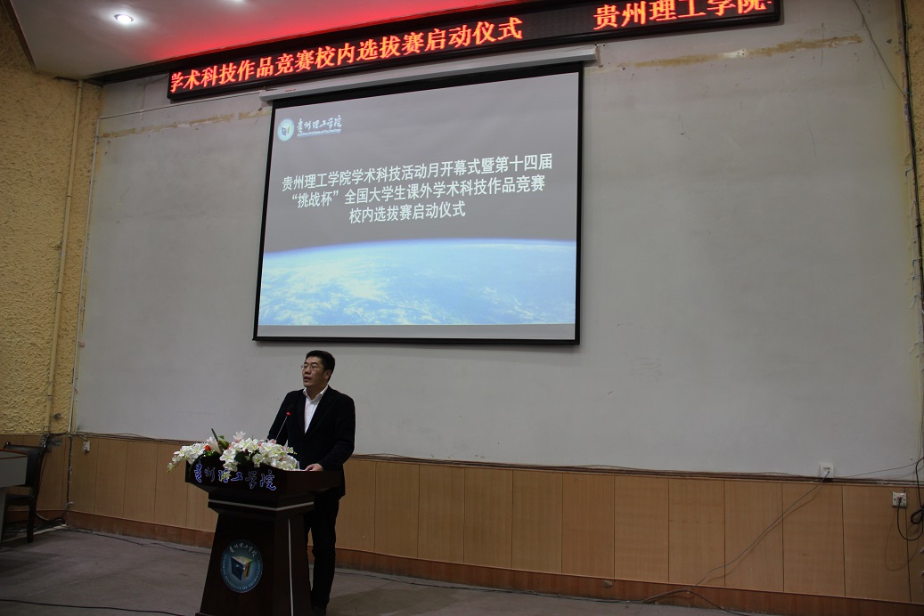 校党委书记曾羽宣布贵州理工学院首届学术科技活动月暨第十四届“挑战杯”全国大学生课外学术科技作品竞赛校内选拔赛正式启动。