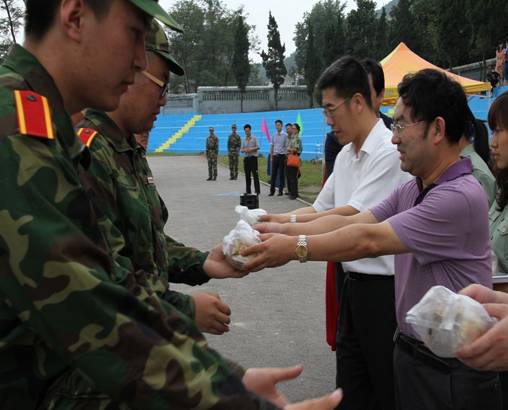 “月到中秋分外明,每逢佳节倍思亲。”中秋佳节间,我校2013级新生正在进行紧张的军训,为了让离家求学的同学们感受到家的温馨,学校党政领导亲临军训现场向军训教官和新生们送去了节日的慰问。