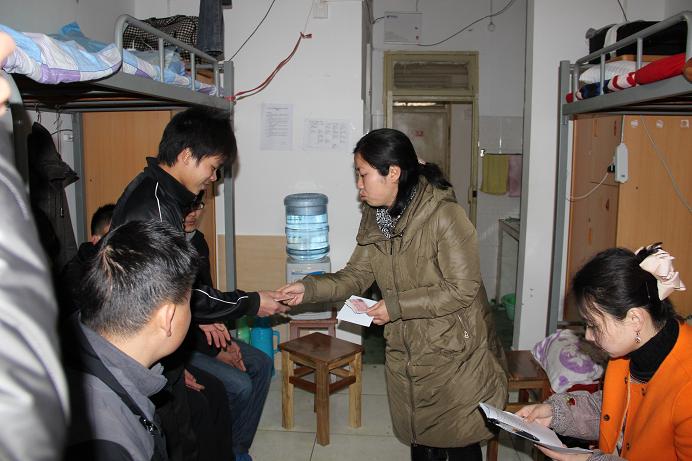 | 2014年1月13日中午,团省委学校部部长尚炬等一行3人来到我校,深入学生宿舍看望慰问我校部分家庭经济困难学生,为他们送去寒假返乡火车票,同时进行了亲切座谈。 校团委副书记金敏对团省委领导莅临我校指导和对我校团员青年的关爱表示感谢,并介绍了我校共青团工作开展情况。 尚炬部长表示,团省委在省属高校开展寒假期间大学生帮扶慰问等有关工作,目的就是是要让经济困难学生感受到团组织的温暖,感受到党和国家的关怀,帮助学生度过祥和愉快的春节假期,她希望同学们认真学习,立志成才,以成为一名理工学子为骄傲,用自己的行动来建设理工学院的美好的明天。 获赠车票的同学们衷心感谢团组织的关怀,并表示将在以后的学习生活中严格要求自己,争做一名合格的新世纪大学生。   |