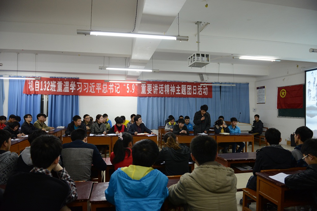 本网讯(曾凯王晓蒙) 3月25日晚7:30—9:00,第三教学楼214教室内气氛热烈,机械工程学院机自132班的同学们在这里开展主题团日活动,校党委书记曾羽与同学们一起,重温学习习近平总书记“5·9”重要讲话精神。