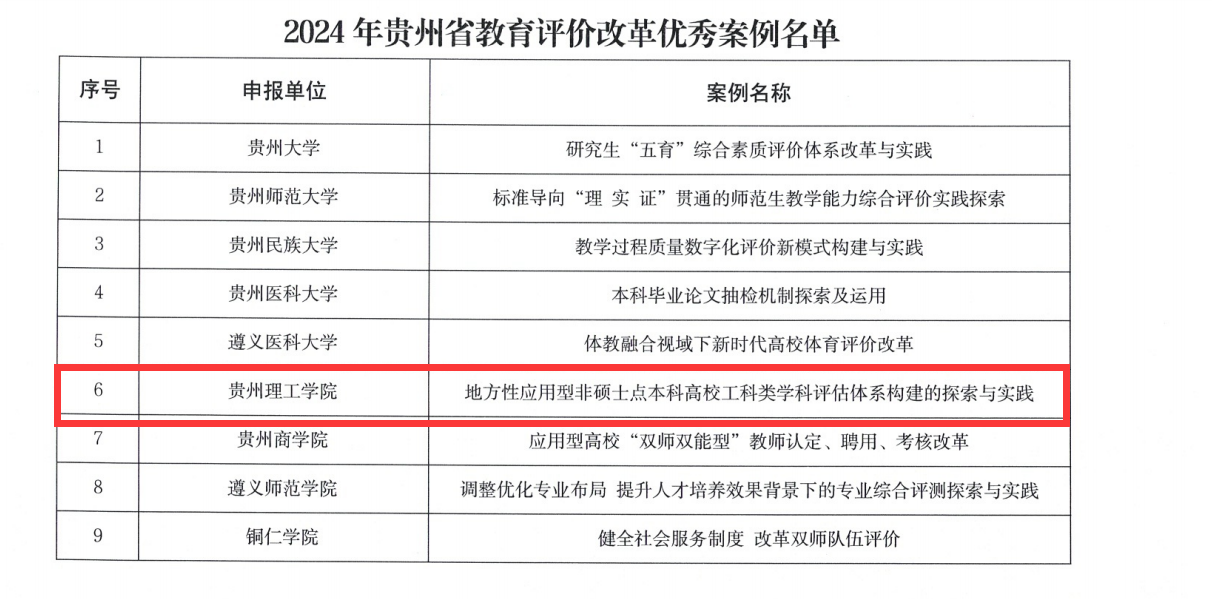 近日,由发展规划处报送的《地方性应用型非硕士点本科高校工科类学科评估体系构建的探索与实践》成功入选贵州省教育厅2024年教育评价改革典型案例。