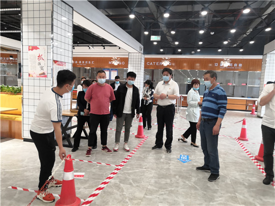 苏向东一行还就校园外围的封闭性;封闭钢网的稳固性、安全性;封闭空间的覆盖范围;宿舍楼、食堂、教学楼、图书馆等楼宇内外通风消杀、管理人员的信息管理和安全防护、宿舍学生基本信息管理、宿舍紧急联系人方式、教室和图书馆自习室桌椅合理摆放、食堂不同取餐区不同菜品种类的对应、就餐区口罩的放置、红外测温枪使用等建设情况进行了详细的现场勘查与指导。