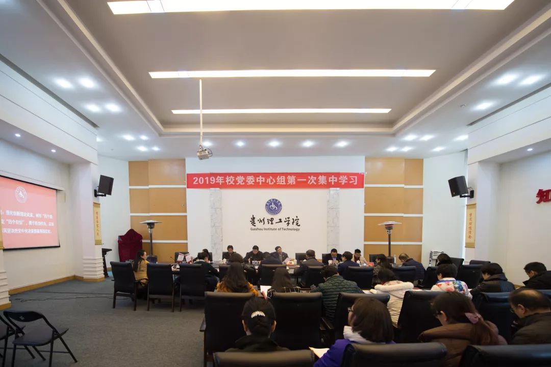 为认真学习贯彻习近平新时代中国特色社会主义思想,贯彻落实党的十九大精神和习近平总书记在贵州省代表团重要讲话精神,以新气象新担当新作为落实好党中央和省委各项决策部署,高质量开好2018年民主生活会,1月7日,以“强化创新理论武装,树牢‘四个意识’、坚定‘四个自信’、坚决做到‘两个维护’,勇于担当作为,以求真务实作风坚决把党中央和省委决策部署落到实处”为主题的2019年校党委中心组第一次集中学习会在喀斯特会议厅召开。校领导曾羽、张波、宋建波、苏向东、胡兴灿、贺梦依出席会议,梁杰列席会议,校直各部门、各教学(教辅)机构党政主要负责人参加学习。