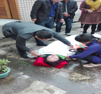 4月20日上午8点过钟,天雨地滑,贵州理工学院杂志社的职工张丽萍同志在学校四合院内摔成重伤,后仰着地,伤情较重,杂志社刘云川社长马上到现场指挥急救,并向赶来的分管领导王建平副校长汇报对伤者的急救措施。
