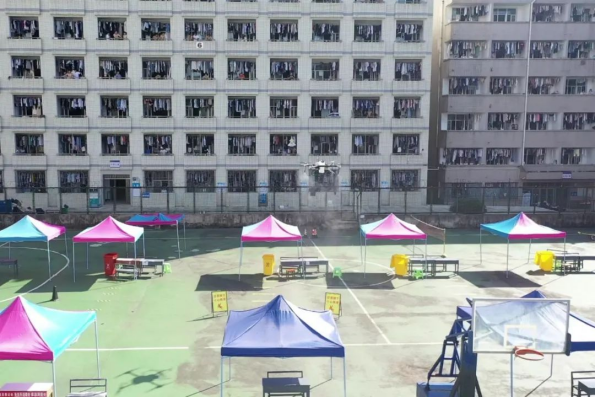 “请同学们起床后提前吃好早餐、洗漱好,在宿舍等待志愿者上门逐层通知大家下楼做核酸,佩戴好口罩,通知到的同学以宿舍为单位前往指定地点,带上手机,携带好个人身份证或学生证,服从志愿者指挥”,这是9月7日早上6点50分学生宿舍楼上空响起的声音。“喊话无人机”化身“大白”,搭载高音喇叭的无人机把校园防疫措施、做核酸检测通知等传遍校园每个角落。同时,“消毒无人机”在学校全域内开展2-3次的消杀工作,为校园带来安全,为师生守住健康。一次次的喊话、一遍遍的消杀,是上宇无人机科创团队学生们的责任,是同心战疫、共克时艰的担当。