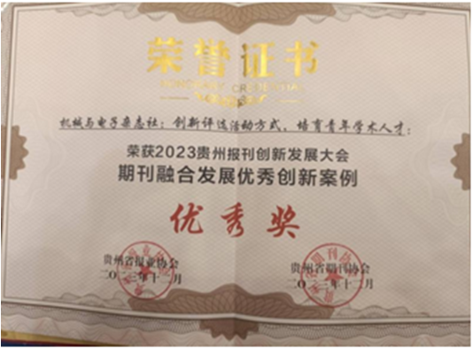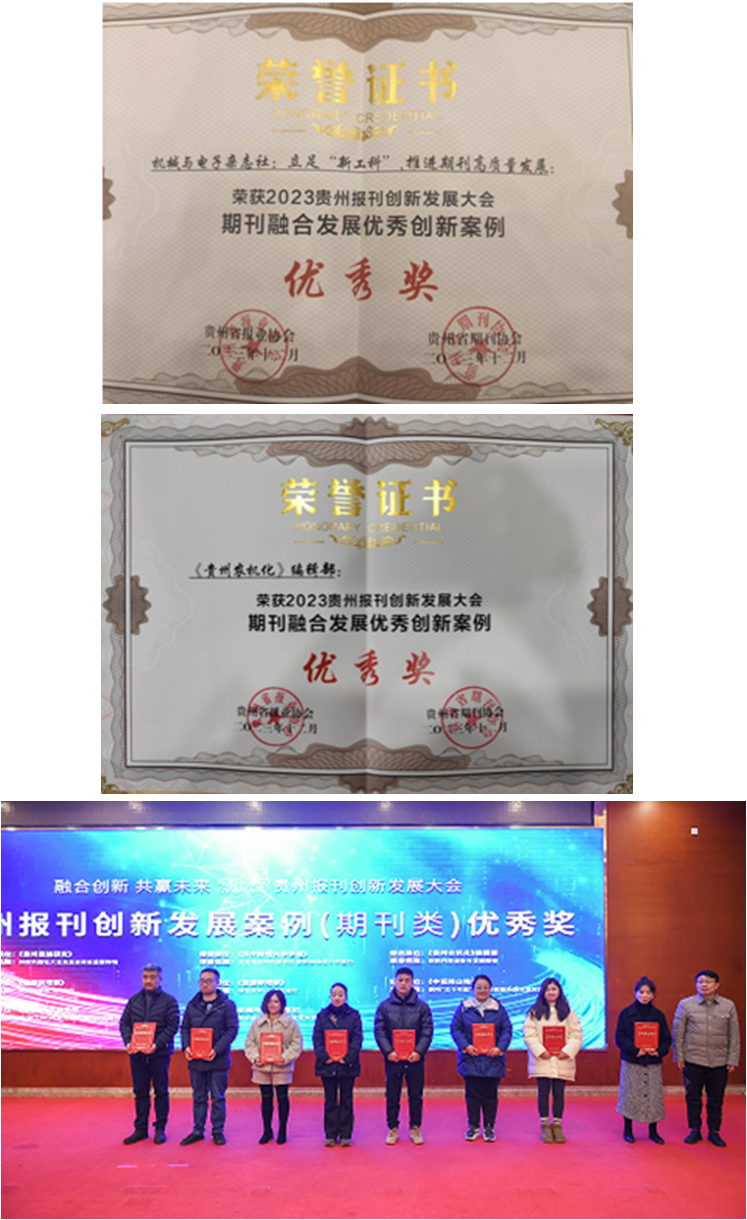 《机械与电子》和《贵州农机化》编辑部申报的融合发展创新案例能获得本次奖项,得益于贵州理工学院对期刊发展的支持和鼓励,更要感谢广大报刊行业同仁的认可和勉励。学报编辑部将在今后的工作中将继续为广大专家学者和学院教学科研服务,向着“奋进新征程,铸建新工科”和期刊融合高质量发展继续奋进。