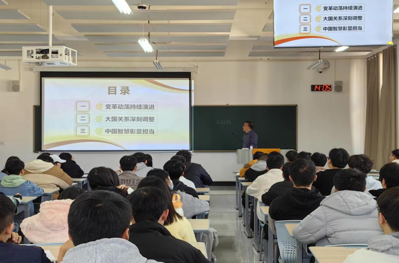 11月27日,副校长张开智以“世界变乱交织 中国笃行担当”为主题,深入网络201、202、203班讲授“形势与政策”课。他勉励同学们要牢记历史使命,坚定理想信念,了解时事政治,了解世界变局,脚踏实地,努力奋进,为走好中国式现代化道路添砖加瓦。