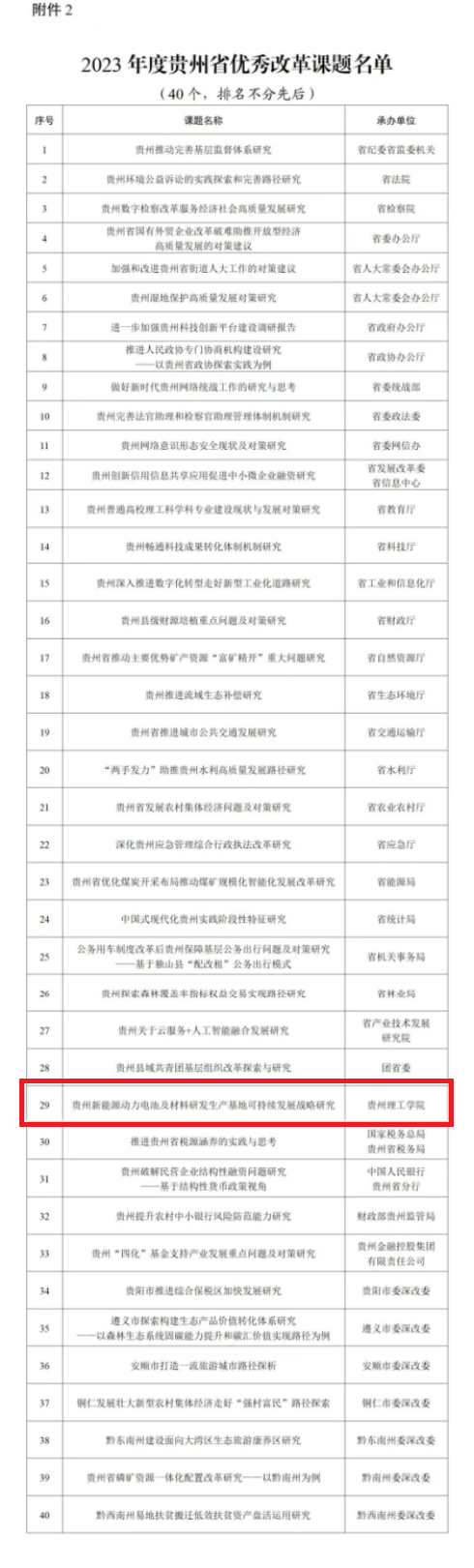 (科技处)近日,中共贵州省委改革办发布了《2023年度贵州省优秀改革成果评选结果通报》,我校主持承担的贵州省委全面深化改革重大调研课题《贵州新能源动力电池及材料研发生产基地可持续发展战略研究》首次获评2023年度贵州省优秀改革课题。