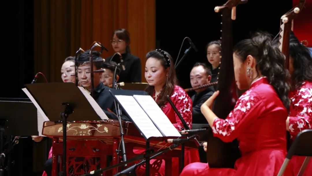 民族管弦乐《我的祖国》二胡率先拉响,古筝紧随其后,竹笛悠扬而起。激昂的锣鼓敲响,尽情抒发着对祖国大地的真挚情感,台下观众无不沉浸其中,随着音乐一同赞颂祖国的辉煌与伟大。
