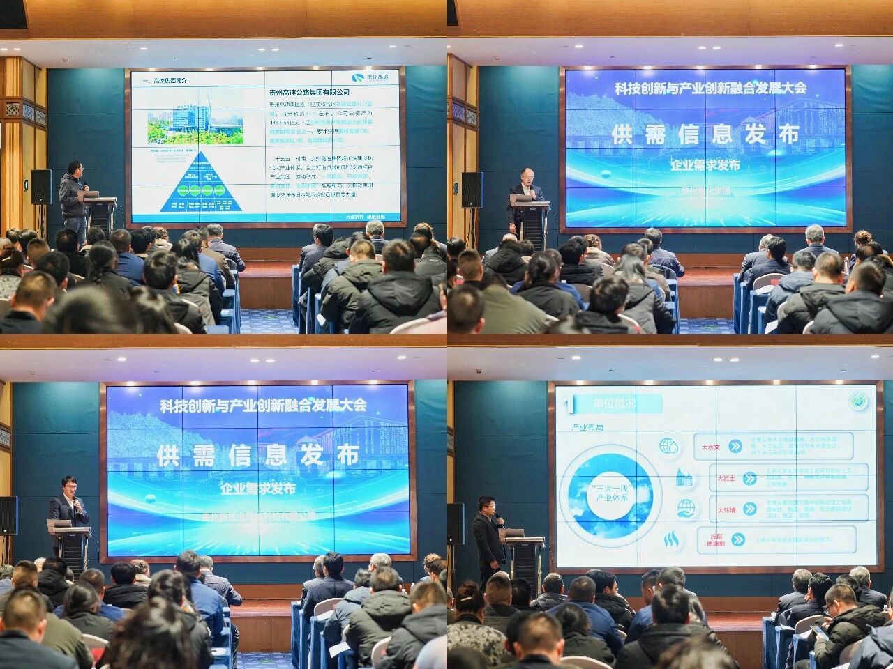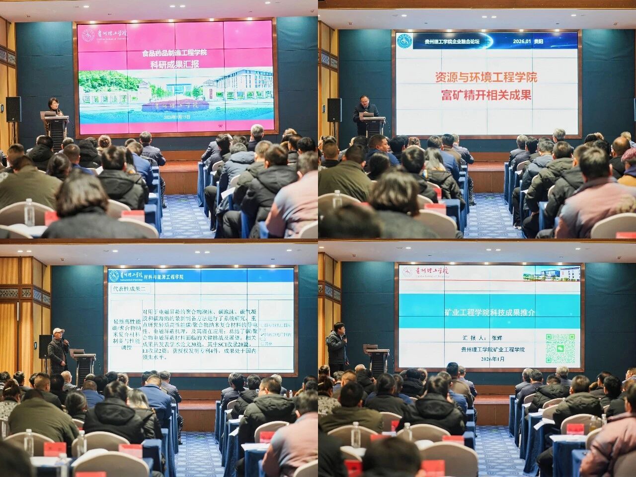 供需信息发布环节成为大会精准对接的核心亮点。贵州高速集团、贵州磷化集团、贵州数据宝网络科技有限公司、贵州省地矿局114地质大队等企业代表依次发布技术需求,聚焦智慧交通、磷化工、数据技术、勘察开发等领域的痛点难点。学校食品药品制造工程学院、资源与环境工程学院、材料与能源工程学院、矿业工程学院等单位负责人分别介绍了涵盖食品酿酒加工、锰渣无害化处理、新材料制备、巷道围岩控制技术及装备多个领域的科技成果,这些成果产业化前景良好,引发企业代表广泛关注。