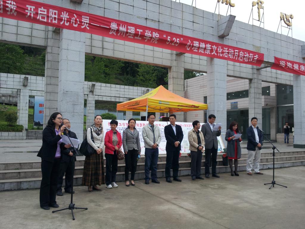 2014年5月4日中午,由贵州理工学院心理健康教育与咨询中心组织举办的 “贵州理工学院‘5·25’心理健康文化活动月”系列活动启动仪式在逸夫广场正式举行,启动仪式由贵州理工学院党委副书记宋广强同志主持,贵州理工学院校党委书记曾羽教授、贵州理工学院院长龙奋杰教授应邀出席,各招生学院分管学生工作副书记、心理辅导员、各班心理委员参加了本次活动,至此贵州理工学院第一届“5·25”心理健康文化活动月系列活动拉开帷幕。