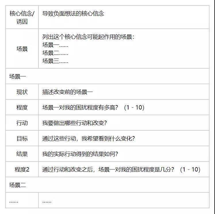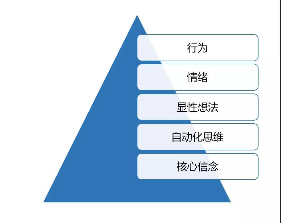 更有效的方法,是自上而下,通过聚焦于想法,去反推自动化思维和核心信念,再慢慢对它们进行优化、调适,把它们引导到一个更健康、更合理的方向。