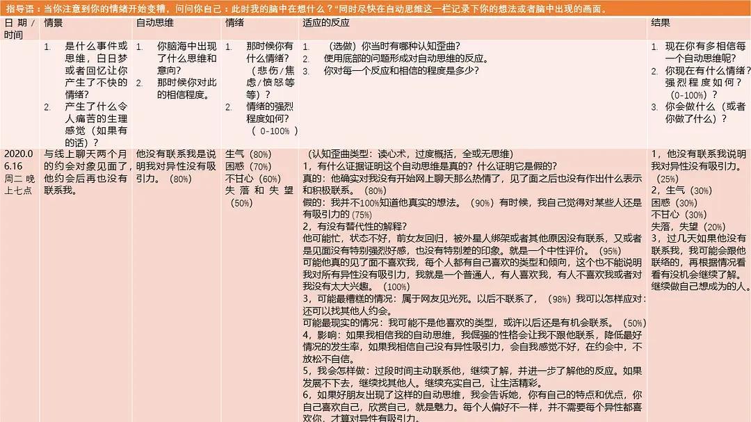 另外,没有一种方法适合所有的人,虽然五栏表在临床中的运用效果是非常有用的,但不代表对所有的人都有用,也不代表对所有的问题和情景都适用。 最后附上这张表格的使用范例: