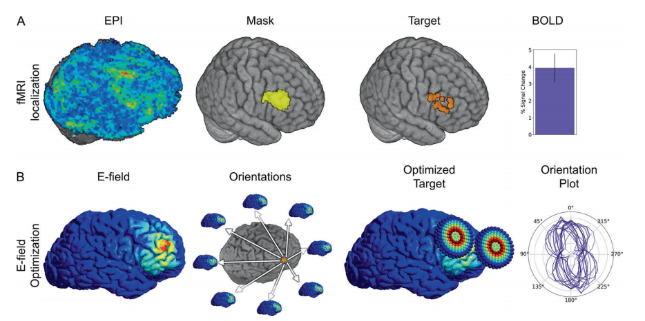 首先对被试进行MRI扫描,并在扫描期间以及TMS刺激期间进行Sternberg工作记忆任务测试,MRI扫描获得的影像数据将被用来进行TMS定位,如图2A,并使用电厂模型来计算偏倚矢量,如图2B。
