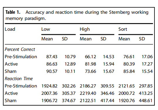 为检查刺激效果,对刺激前-刺激条件(真实刺激/假刺激)计算差异分数,并针对认知负荷条件进行成对样本t检验。结果发现与真刺激相比,假刺激条件下,低和排序的认知负荷在准确性方面有更大的改善效果(Low:t(18)=-1.766;p=0.094; Cohen’s d=0.402; High:t(18)=-1.837;p=0.083;Cohen’s d=0.426)。高认知负荷则有着相反的趋势(High:t(18)=1.811;p=0.087;Cohen’s d=0.415)。
