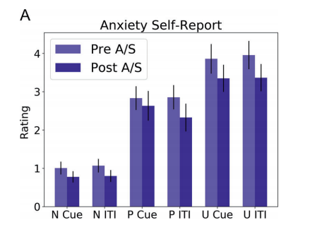 焦虑等级:对于NPU实验前事先收集到的测量结果进行2(时间点:刺激前 vs. 刺激后)*2(刺激:真实刺激 vs. 假刺激)*3(NPU:中性 vs. 可预测 vs. 不可预测)*2(时期:提示出现时 vs. ITI时期)多因素重复测量方差分析。