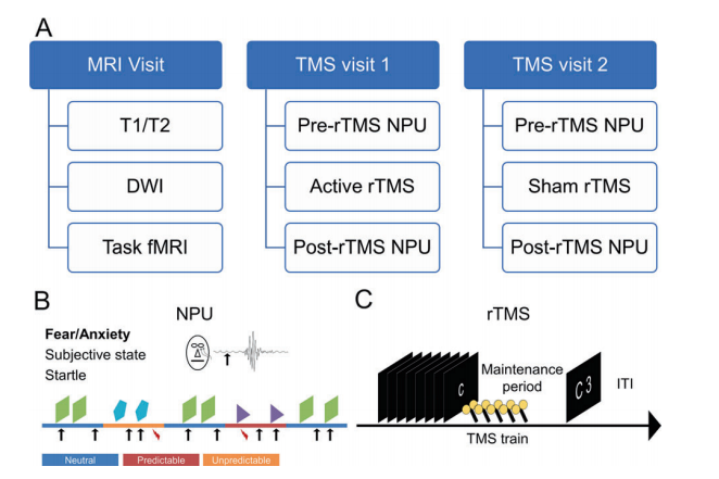 使用中性/可预测/不可预测(NPU)威胁任务评估被试接受rTMS刺激前后的焦虑状态。具体范式如图1所示。