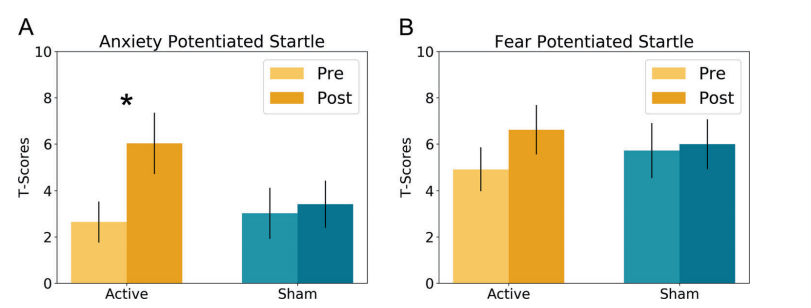 为了量化焦虑增强惊吓效应(APS)和恐惧增强惊吓效应(FPS),创建一种差值算法(APS=U ITI-N ITI; FPS=P Cue-P ITI)。对于APS和FPS结果进行2(刺激:真实刺激 vs. 假刺激)*2(时间点:刺激前 vs. 刺激后)重复测量方差分析。
