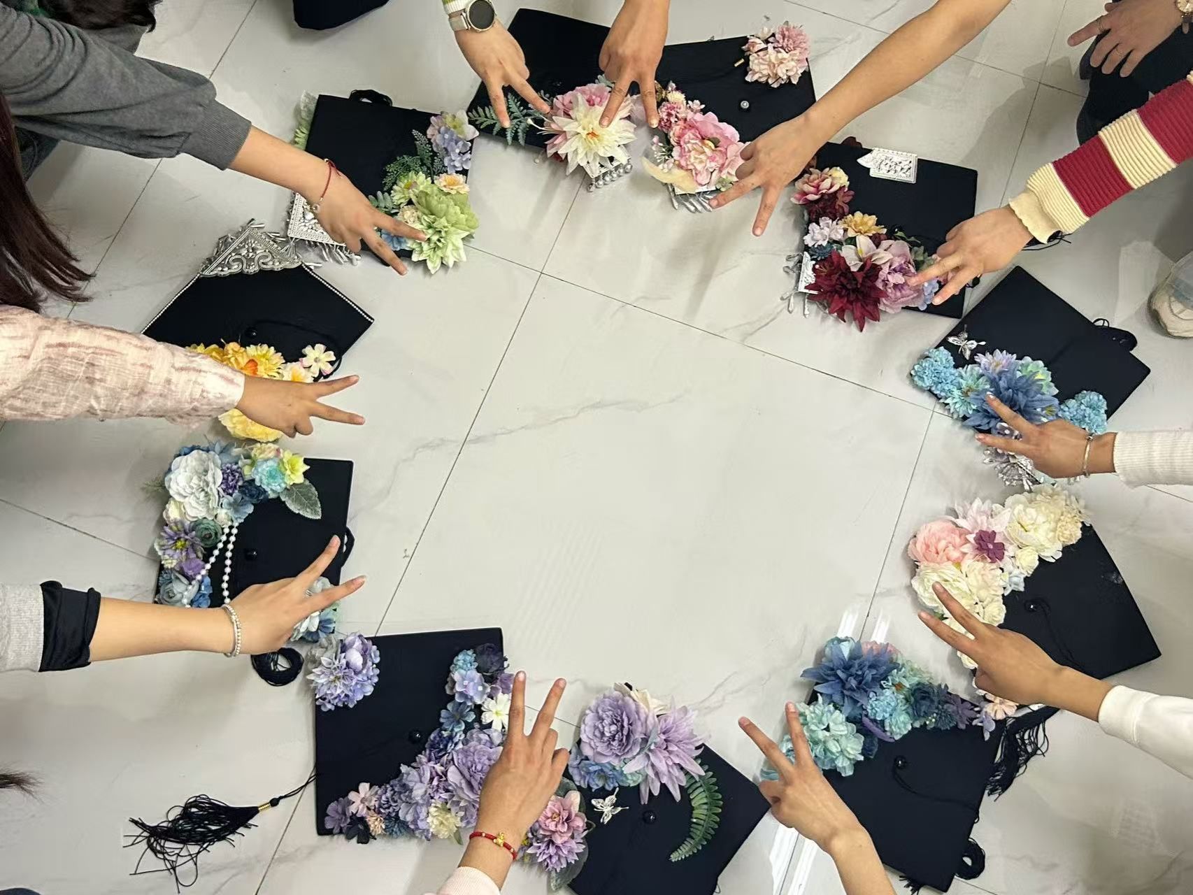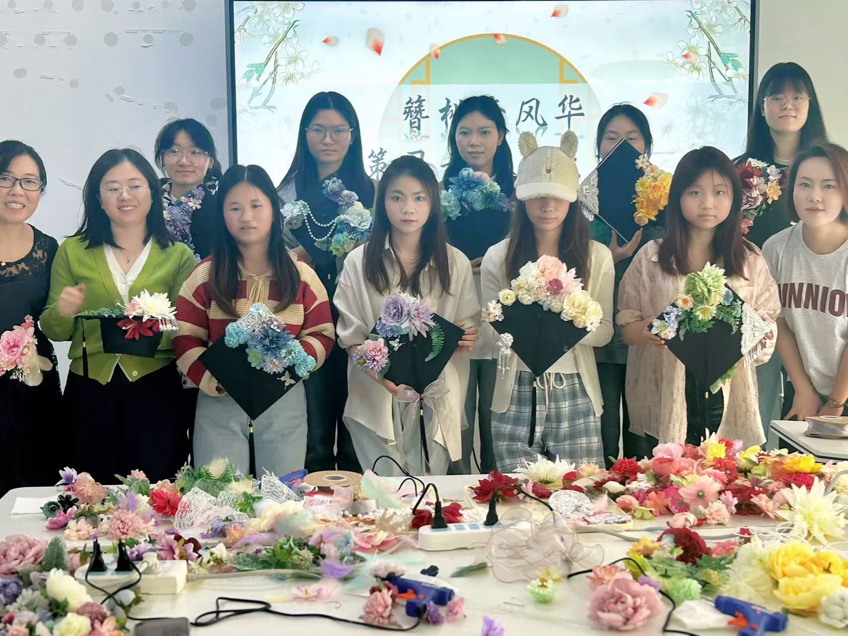 活动现场准备了热熔胶、各类仿真花及装饰材料,在老师们的悉心指导下同学们充分发挥创意,精心挑选各式花材,将四载芳华凝于指尖。当一顶顶绽放的"花冠"在镜头前闪耀,时光仿佛在这一刻变得柔软。