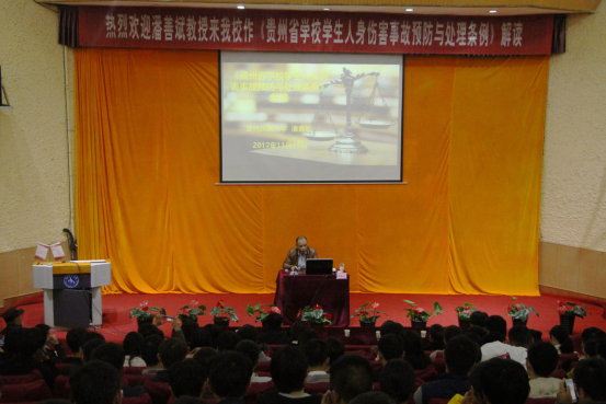 11月14日晚,贵州民族大学潘善斌教授在逸夫学术交流中心小报告厅为我校师生作《贵州省学校学生人身伤害事故预防与处理条例》的解读。参加本次讲座的人员有学生工作部、保卫处全体工作人员,各学院分管学生工作书记或副书记、学生科科长、辅导员、班主任、学生护校队队员、学生代表。讲座由学生工作部副部长蒋文韬主持。