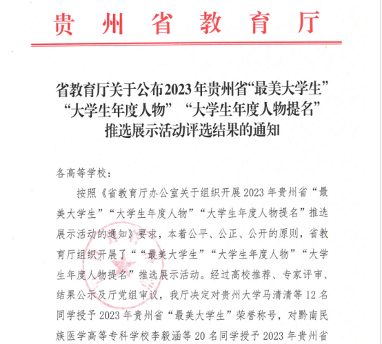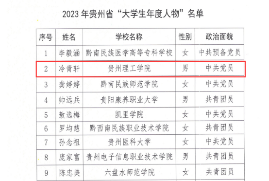 本网讯(学生工作部 夏玉丽)近日,我校冷青轩同学在省教育厅组织开展的2023年贵州省“最美大学生”“大学生年度人物”“大学生年度人物提名”推选展示活动中喜获“大学生年度人物”荣誉称号。