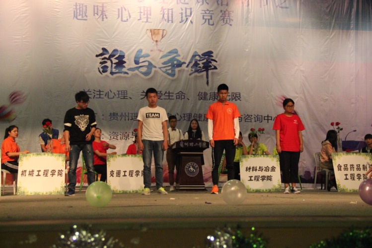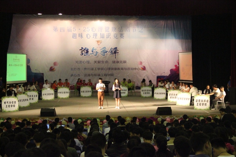 2017年5月16日,由校心理健康教育与咨询中心主办、资源与环境工程学院承办的校第四季“5.25”心理健康文化活动节之“悦成才”趣味心理竞赛在逸夫大礼堂圆满完成。此次竞赛共有资源与环境工程学院等12个学院组织的12个队参加,聘请了国家二级心理咨询师、贵州大学心理咨询中心兼职心理咨询师曹浩老师以及校内心理咨询中心部分老师作为评委,学工部领导、各学院分管学生工作书记(副书记)参观了比赛。