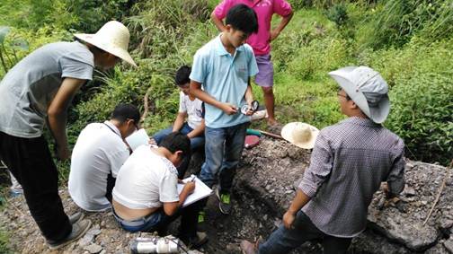 在学校党委、行政统一部署下,在我院党、政领导统一安排下,由资环学院龙汉生博士担任社会实践队长的实践组一行9人于2015年8月出初奔赴贵州省有色金属和核工业地质勘查局七总队(下简称七总队)野外矿产勘查区进行实习。期间分别在黔东南苗族侗族自治州从江县花岗岩型铀矿战略选区和铜仁市江口县黄坝镇磷铀矿与七总队野外技术工作人员一起爬山涉水,共同体验野外地质生活、学习野外地质工作方法。