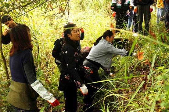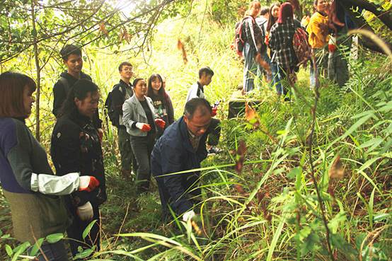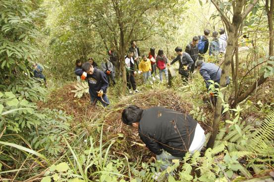 自今年四月清明过后,老师同学们又一次来到了这里,经过半年的光阴,曲折的小路已被杂草覆盖。资环老师们不怕辛苦,按照记忆中的路线带领着学生会代表一起斩草开路,最终在比人还高的草海中开辟出了一条道路。