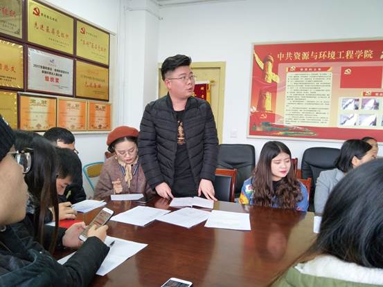 2018年12月20日中午12:30,资环学院学生党支部在行政楼603会议室,开展了关于“学习《中国共产党支部工作条例( 试行)》抓好新时代党支部建设”的主题党日活动,学生党支部全体党员参与了此次活动,活动由学生党支部书记李永老师主持。