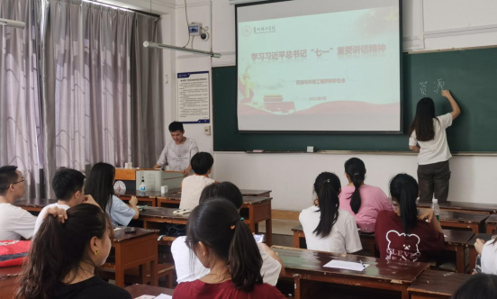 为深入贯彻学习习近平总书记“七一”重要讲话精神,2021年9月27日13:00,资源与环境工程学院于三教203教室举办了学习“七一精神”大会。大会参与人员有学院学生科科长张双菊老师与学生会全体成员。