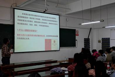 梁珍副书记从促进大学生个人成长、推动全面国防教育需求等方面向在座同学讲解了大学生积极应征入伍的重要意义。指出作为当代青年的生力军和领跑者,大学生有责任、有义务积极报名应征,投身国防,为实现“强军梦”建功立业。随后,杨巍老师向同学们传达了《关于做好贵州理工学院2019年兵役登记工作》、《贵州理工学院鼓励在校大学生应征入伍实施办法》等文件精神,并从兵役登记的范围条件、大学生应征入伍优惠政策,征兵程序安排等方面为同学们进行了详细解读。鼓励同学们立志献身国防事业,号召同学们踊跃应征报名,为国防建设奉献青春力量,为学校和学院增光添彩。