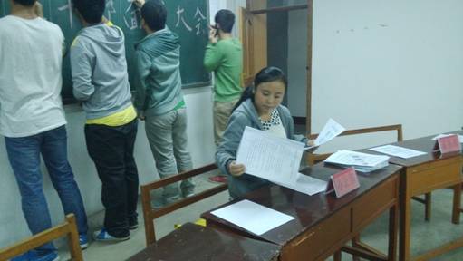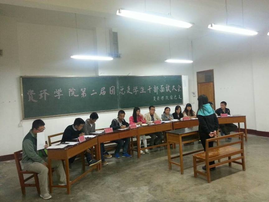 2014年10月14日19:00-21:00,资环学院团总支在1教402进行招新。早在18:00左右,团总支副书记及各部门成员便来到面试地点布置会场,黑板上整整齐齐的写着“资环学院第二届团总支学生干部面试大会”。