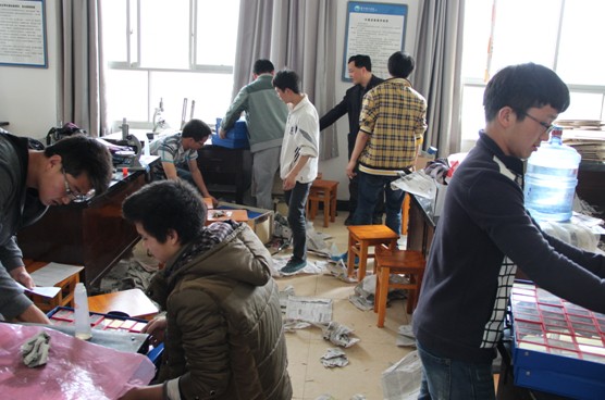 从4月11日开始至4月底,资环学院三十余名同学,利用自己的课余时间参加了整理实验室义务劳动。在聂爱国院长的带领下,几位实验室老师给大家分配了任务,接着同学们便以饱满的热情投入到工作中,积极配合实验室老师进行实验室整理:有贴标签的,有拖地的,有搬运标本的……大家都忙得热火朝天,不亦乐乎。