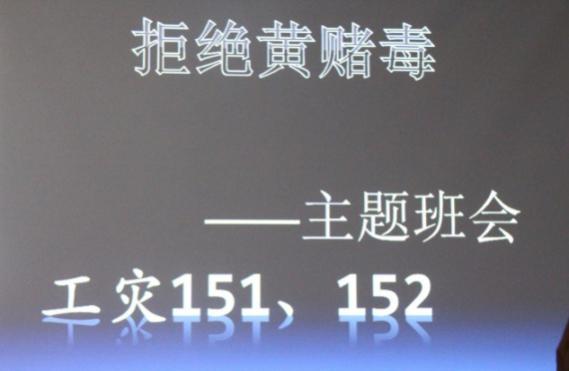 2016年3月23日星期三晚上7点半,资源与环境工程学院工灾151、152班全体同学及班主任辅导员老师在学工部三楼师生服务大厅举行了《拒绝黄赌毒》的主题班会。