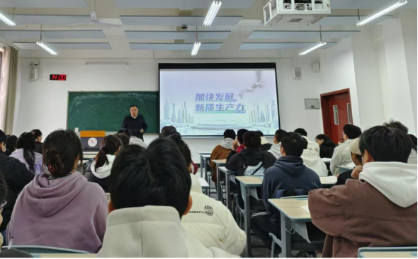 2024年11月20日下午,资源与环境工程学院资勘221和环境221班级的同学们迎来了一堂别开生面的《形势与政策》课程,本次课程由潘良明校长亲自授课,主题为《加快发展新质生产力》。