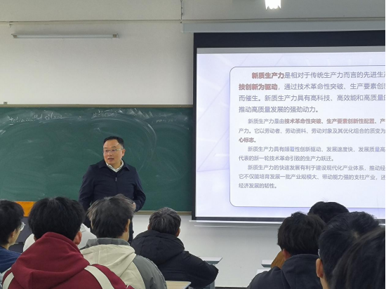 课堂上,潘校长以丰富的案例展开教学。在谈到新质生产力在农业方面的体现时,他从古代传统的农耕方式,到现代农业借助高科技手段所实现的巨大变革,娓娓道来,生动详实的阐述了生产力发展的脉络。不仅如此,他还结合自身的经历,将抽象的理论变得更加通俗易懂,使同学们能够深刻地感受到新质生产力对社会发展的重要意义。