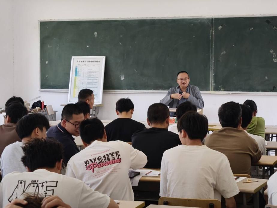 郑伟书记、龙汉生副院长来到四楼大教室与同学们交流。在与实习师生的交流中,对资源与环境工程学院地质填图实习的有序组织、规范开展给予充分肯定,对全体指导教师坚守岗位、悉心指导,以及同学们积极参与、认真实践的态度表示高度赞扬。郑书记指出,地质填图实习是资源勘查工程、地质工程等相关专业实践教学的重要组成部分,是衔接理论知识与工程实际的关键环节,更是锤炼学生专业技能、培养工程素养的重要平台,对学生今后从事地质勘察、环境治理、土地整治等相关工作具有重要意义。