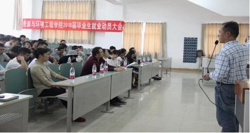 2017年9月29日中午,资源与环境工程学院在3教415组织开展了2018届毕业生就业动员大会,学院党总支书记(院长)刘幼平、副书记吴维义、副院长龙汉生出席此次动员大会。大会由学生科副科长张双菊主持,14级全体学生、班主任和辅导员共同参加了此次动员大会。