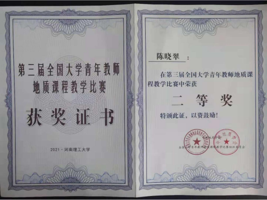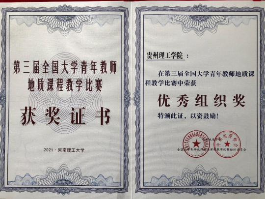 比赛共分为沉积古生物、工程地质、构造、能源矿产、普地、水文、岩矿、综合等八个赛组。选手参赛充分展现了地质课程的经典理论和前沿进展,体现了课程的专业性和全面性。经过两天激烈角逐,我校资源与环境工程学院青年教师陈晓翠、杨巍在比赛中获得二等奖佳绩,贵州理工学院获优秀组织奖。